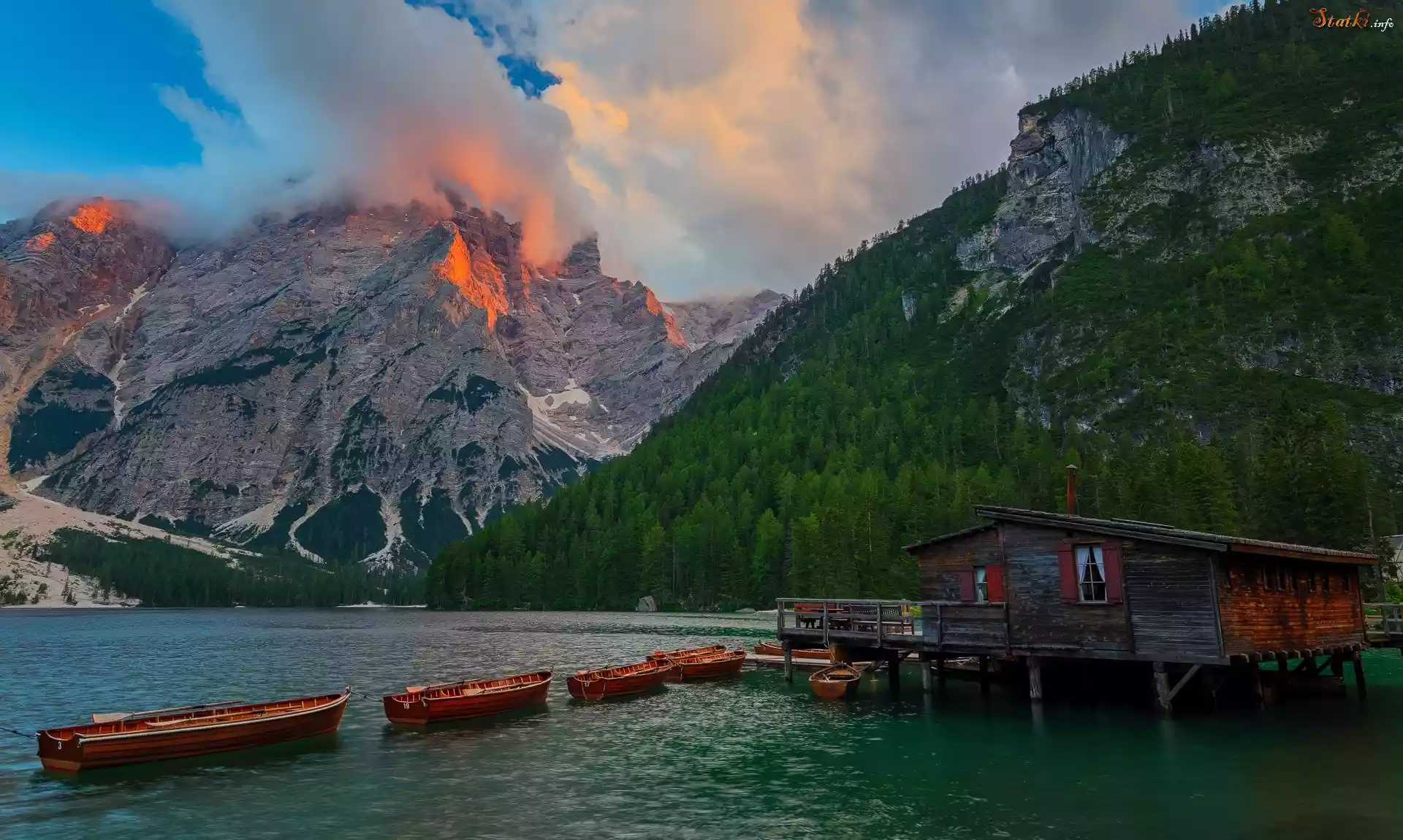 Włochy, Południowy Tyrol, Jezioro Pragser Wildsee, Lago di Braies, Góry, Dolomity, Drewniany, Domek, Łódki, Chmury |