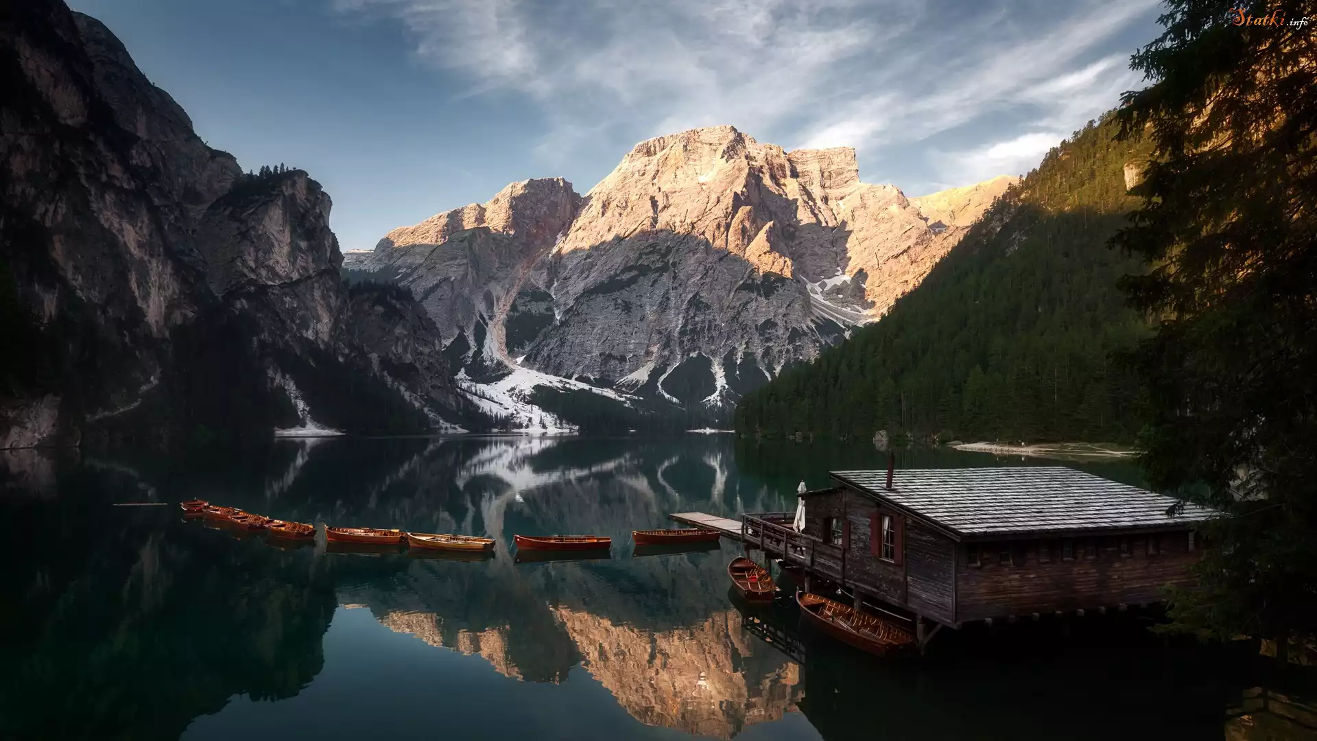 Statek Włochy, Jezioro Pragser Wildsee, Lago di Braies, Góry Dolomity, Pomost, Drewniany, Domek, Łódki