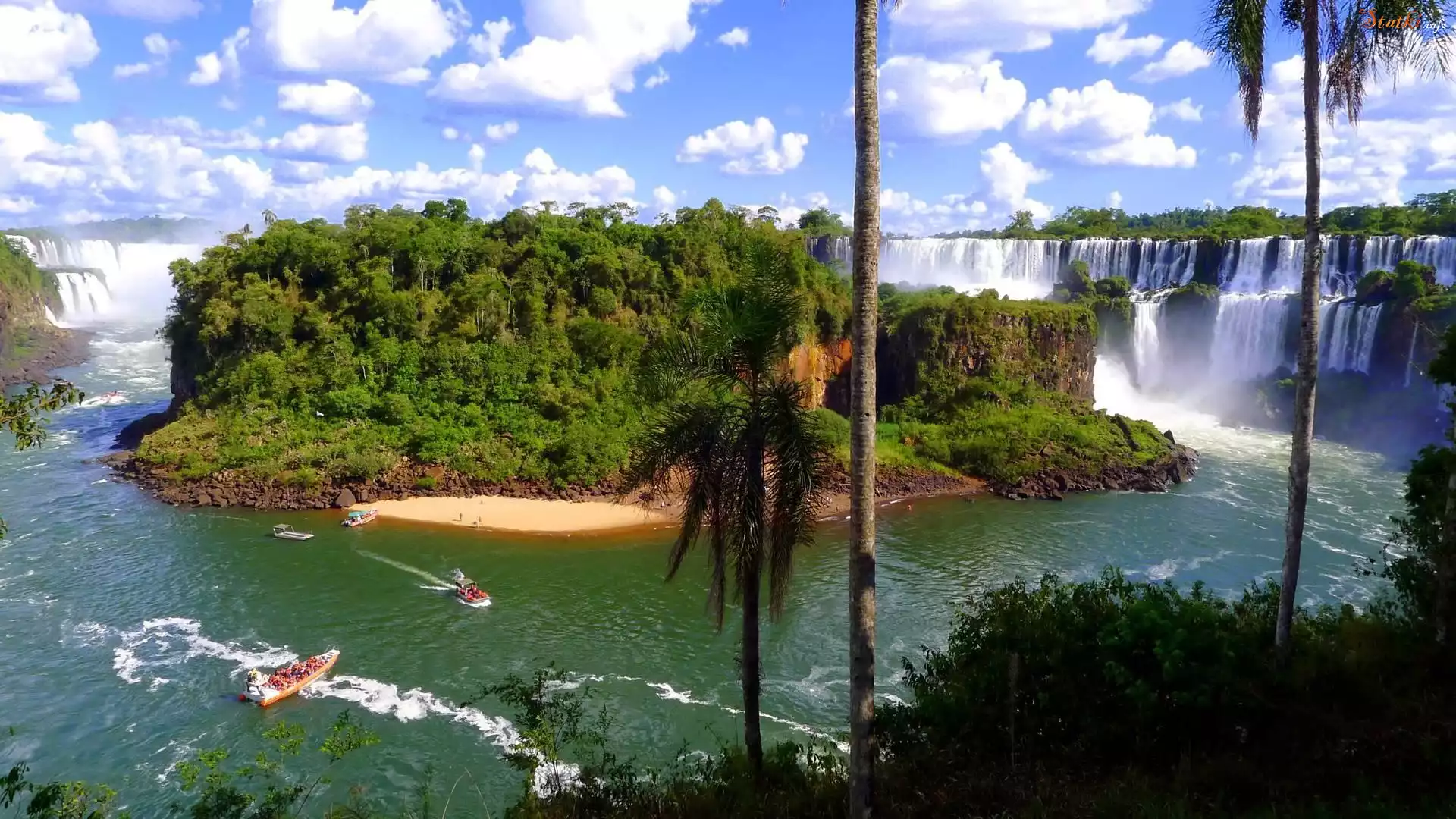 Wodospady, Iguazu, Łódki, Drzewa, Chmury
