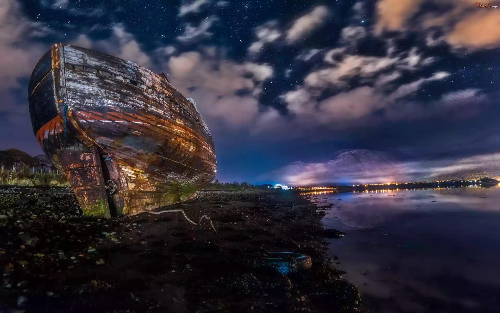 Statek Brzeg, Wrak, Statku Morze, Niebo, Miasto, Nocą