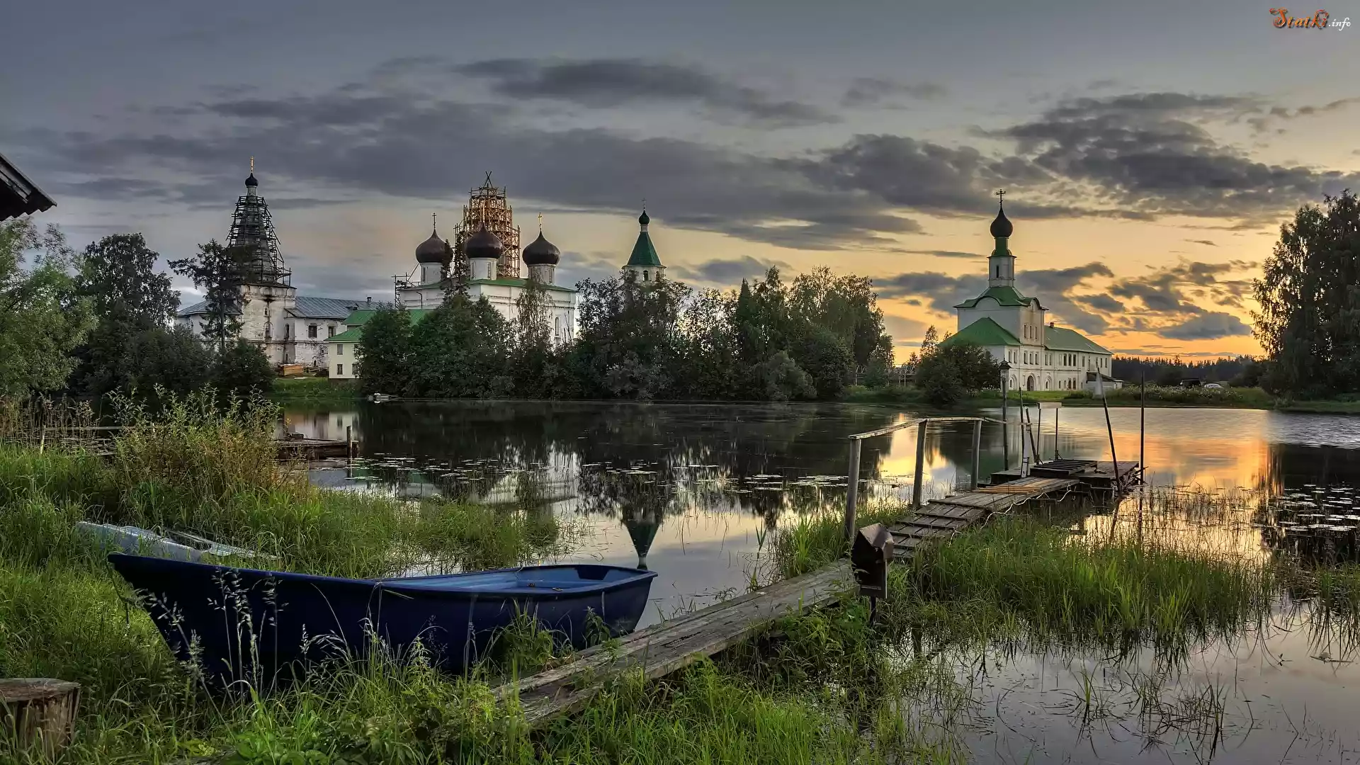 Wschód słońca, Jezioro Michajłowskie, Łódka, Pomost, Trawa, Drzewa, Cerkiew, Antoniewo-Sijski Monaster Trójcy Świętej, Obwód archangielski, Rosja |