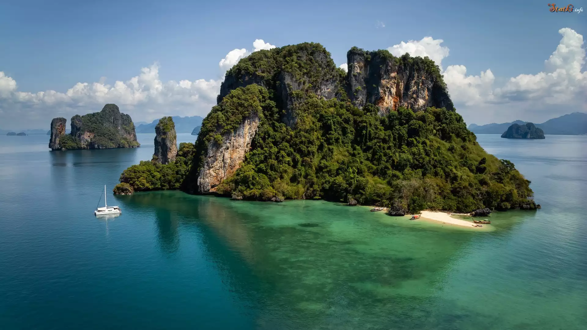 Statek Morze, Wyspy, Skały, Drzewa, Niebo