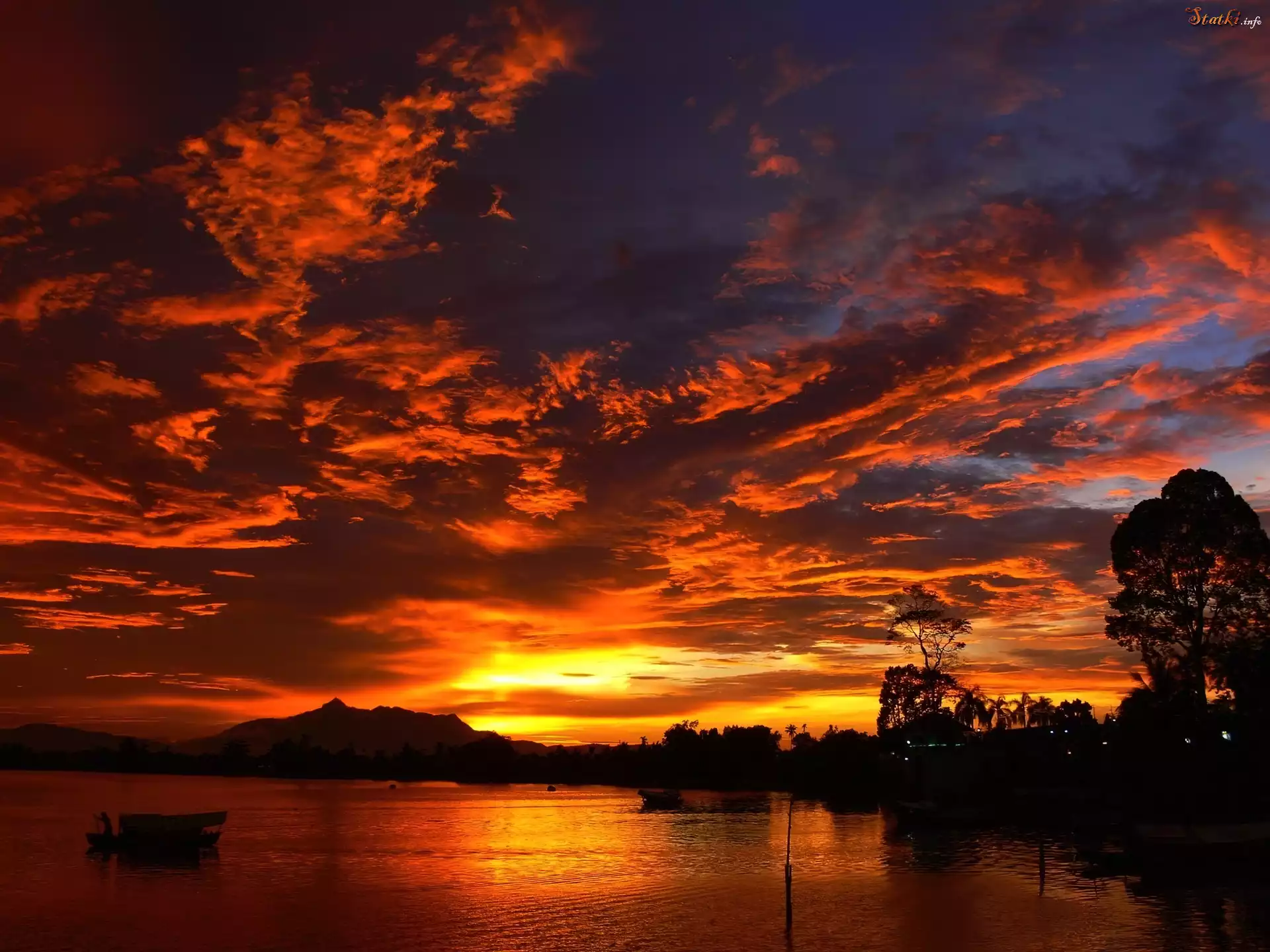Zachód, Słońca, Chmury, Morze, Drzewa, łódź