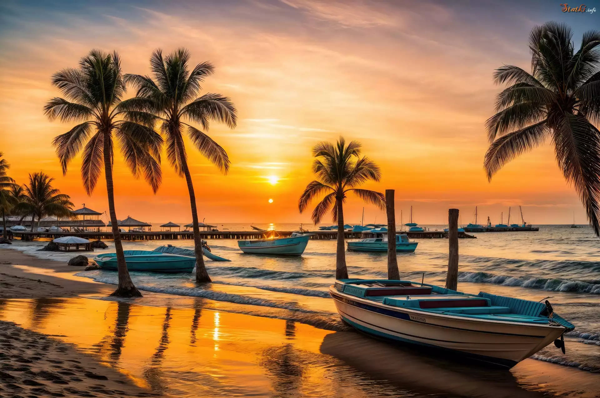 Statek Morze, Łódki, Palmy, Zachód słońca, Grafika