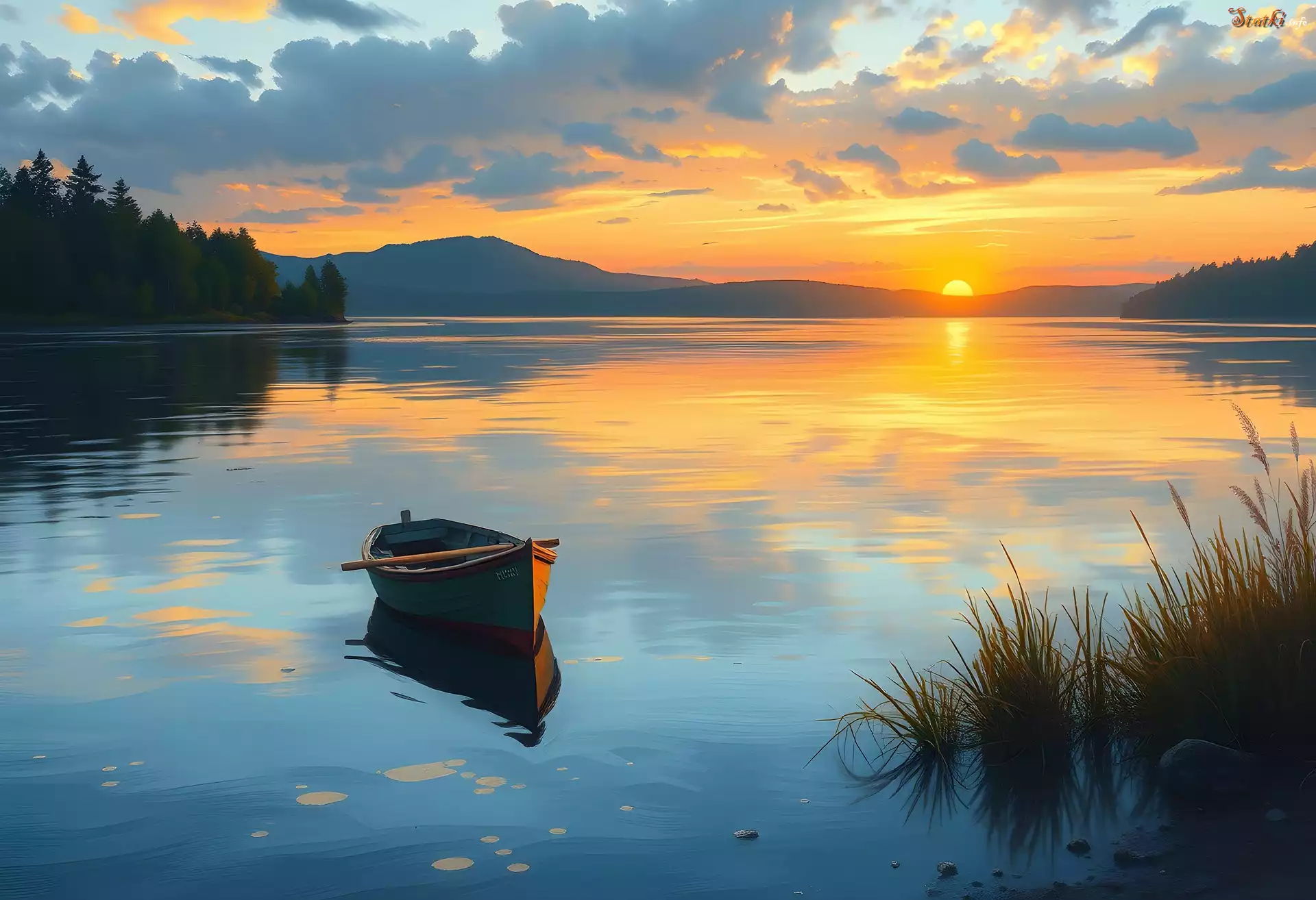 Statek Jezioro, Łódka, Trzciny, Zachód słońca, Grafika