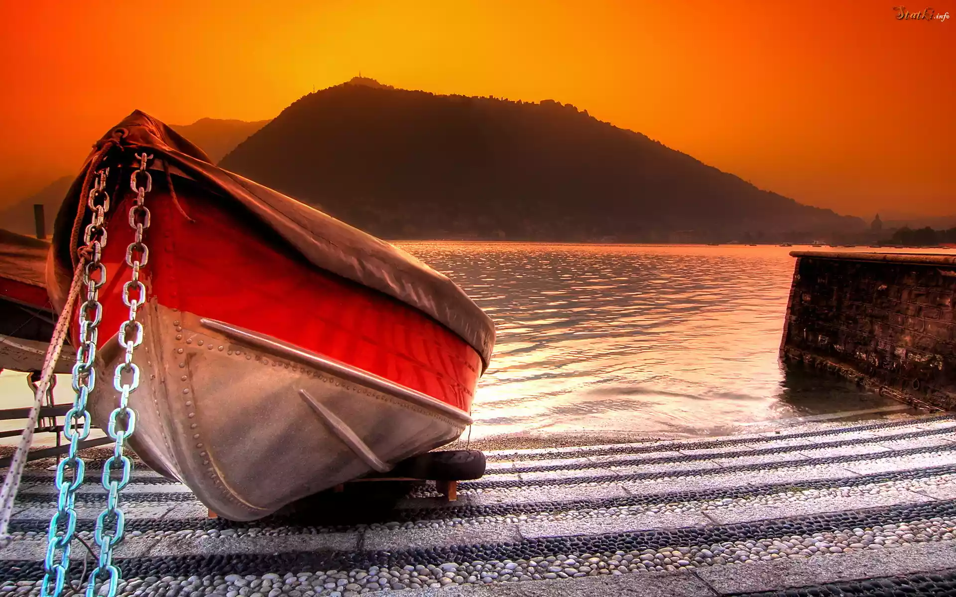 Statek Zachód, Słońca, Góra, Jezioro, Łódka