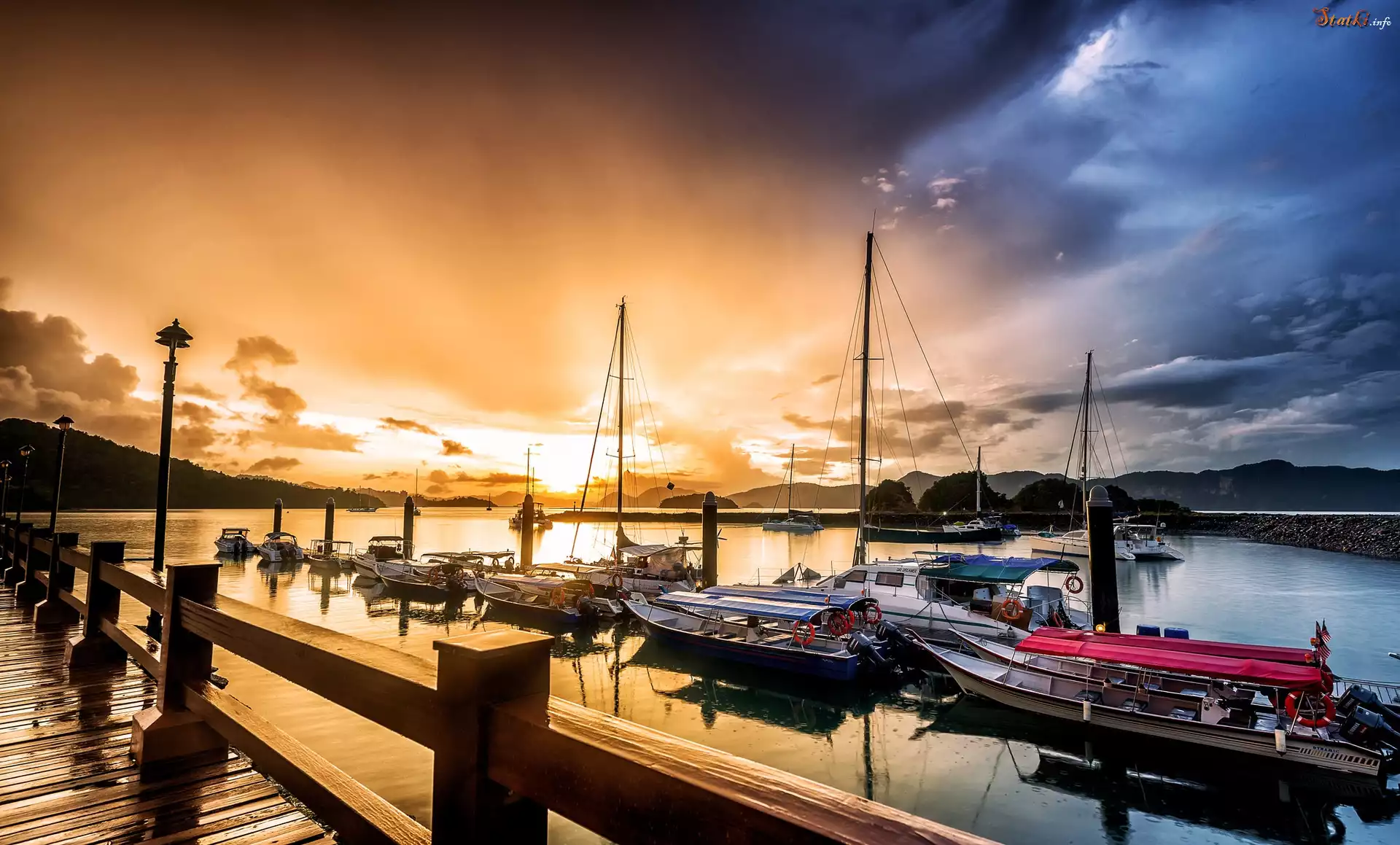 Jezioro, Zachod, Slonca, Chmury, Lodki,Jachty, Molo