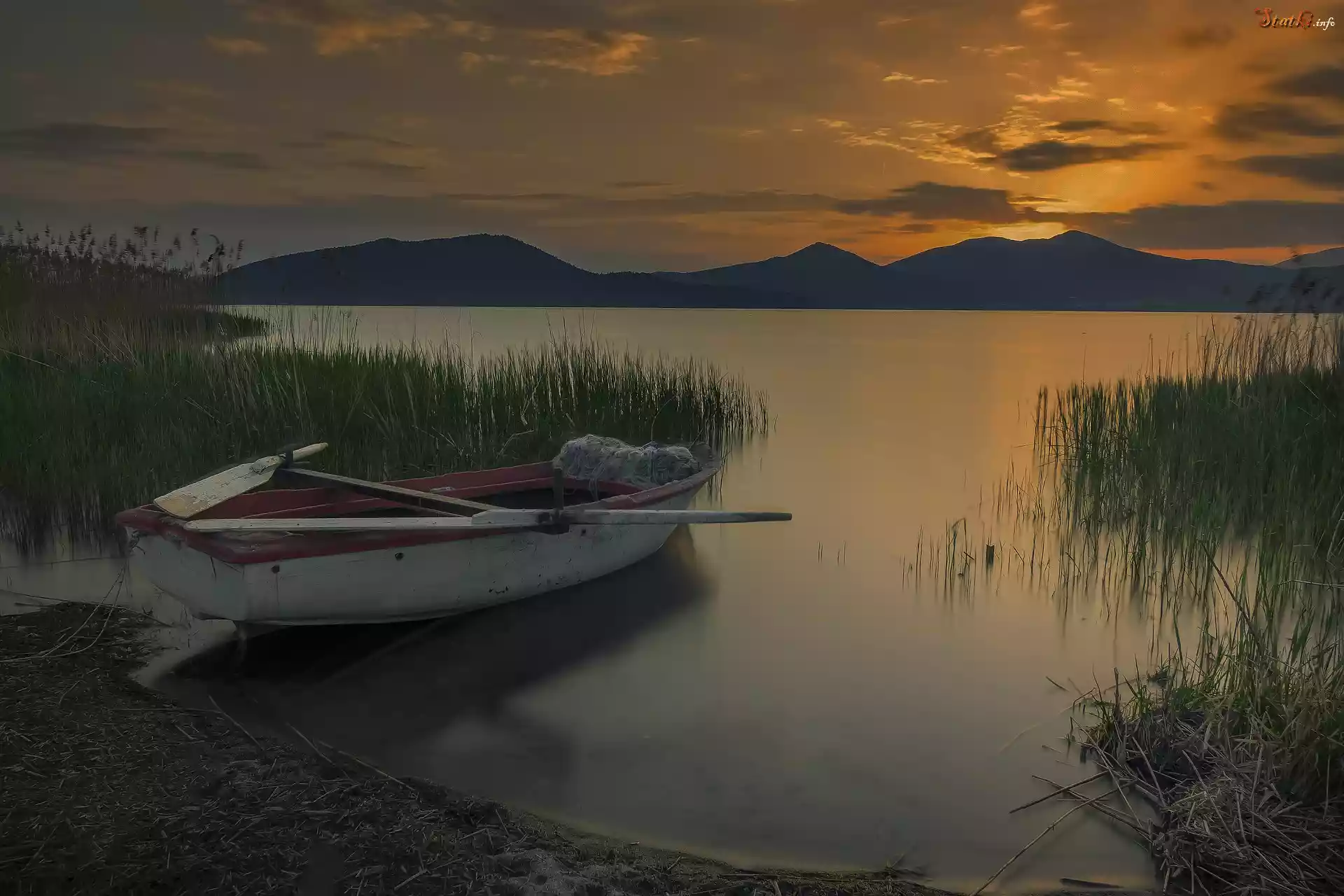 Statek Łódka, Jezioro, Szuwary, Zachód słońca