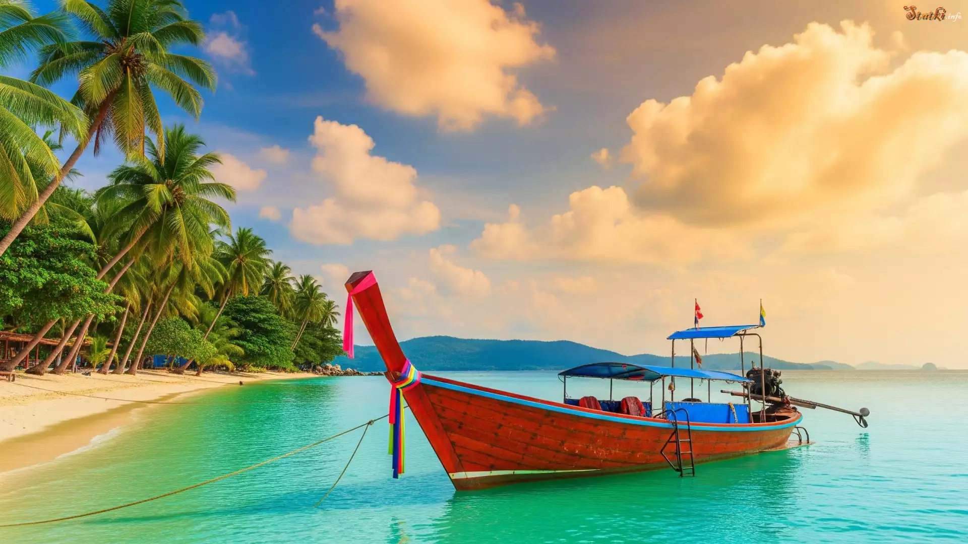 Statek Morze, Plaża, Palmy, Zachód słońca, Łódka