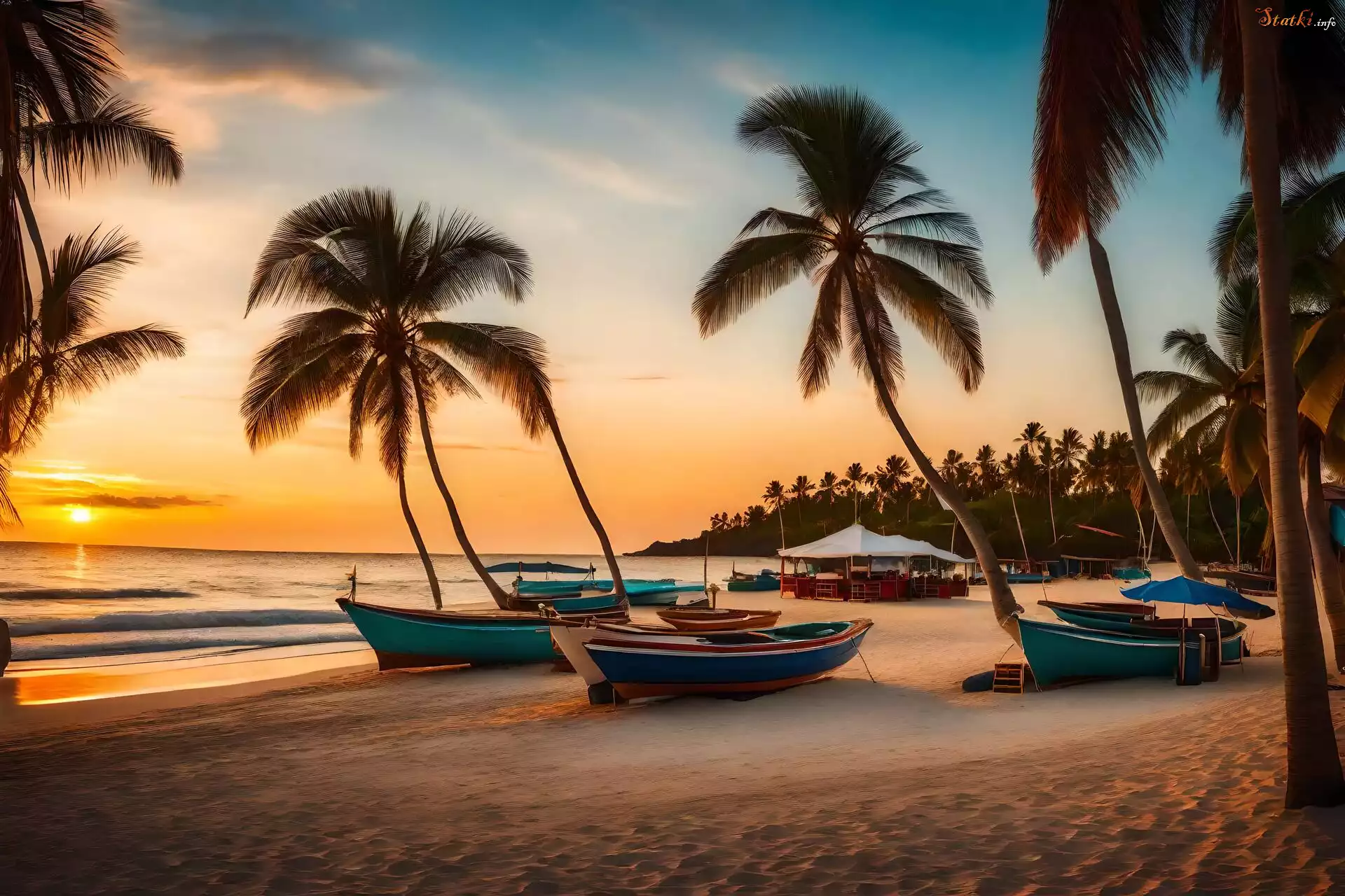 Morze, Plaża, Palmy, Zachód słońca, Łódki