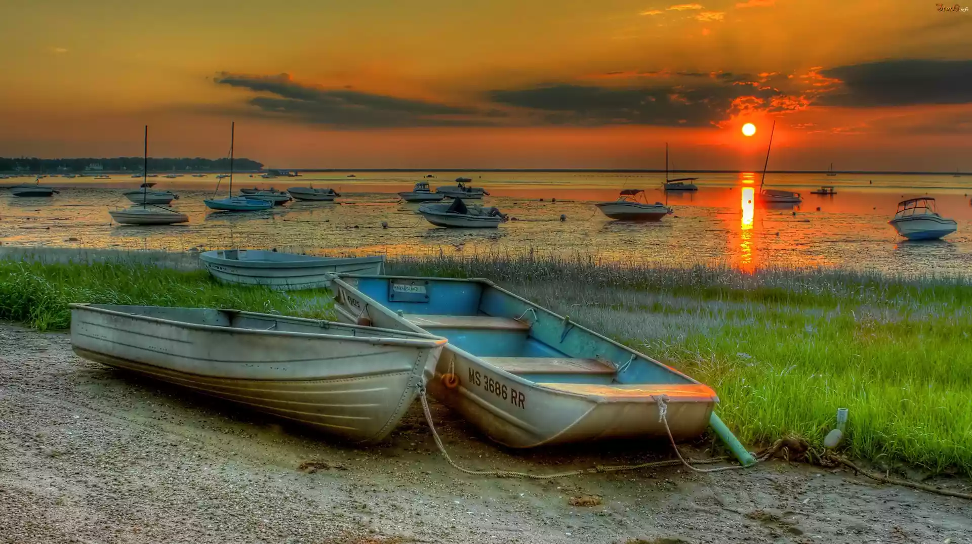 Statek Zachód, Słońca, Morze, Łódki