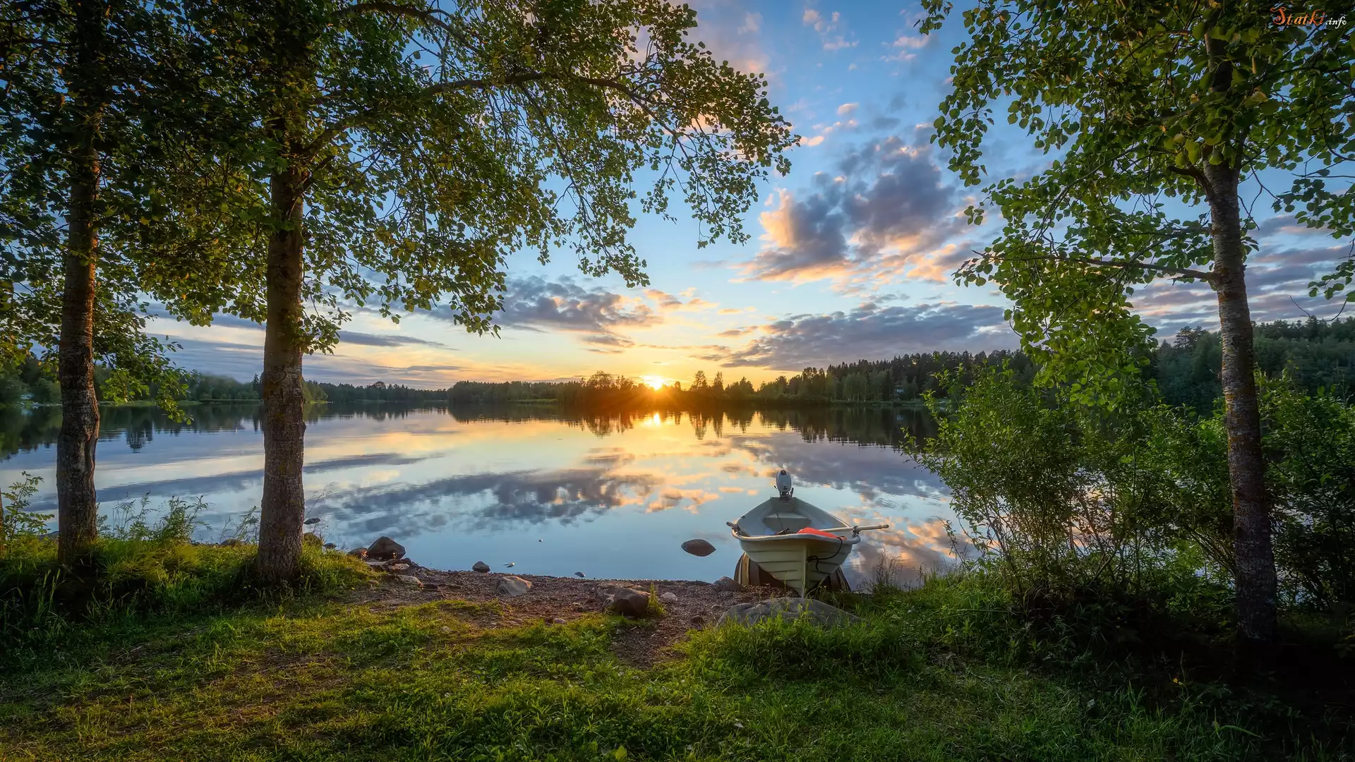 Zachód słońca, Łódka, Drzewa, Rzeka Oulujoki, Oulu, Finlandia
