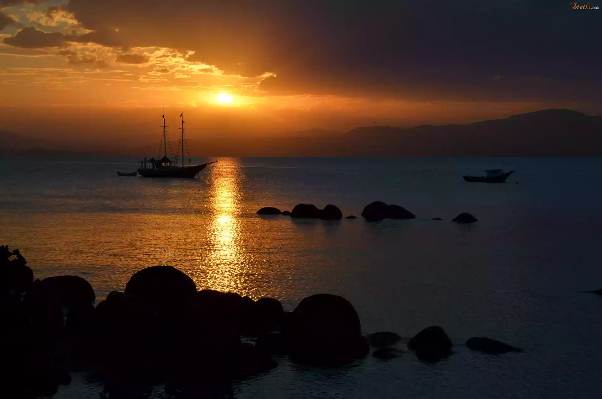 Statek Zachód, Słońca, Morze, Skały, Żaglowiec