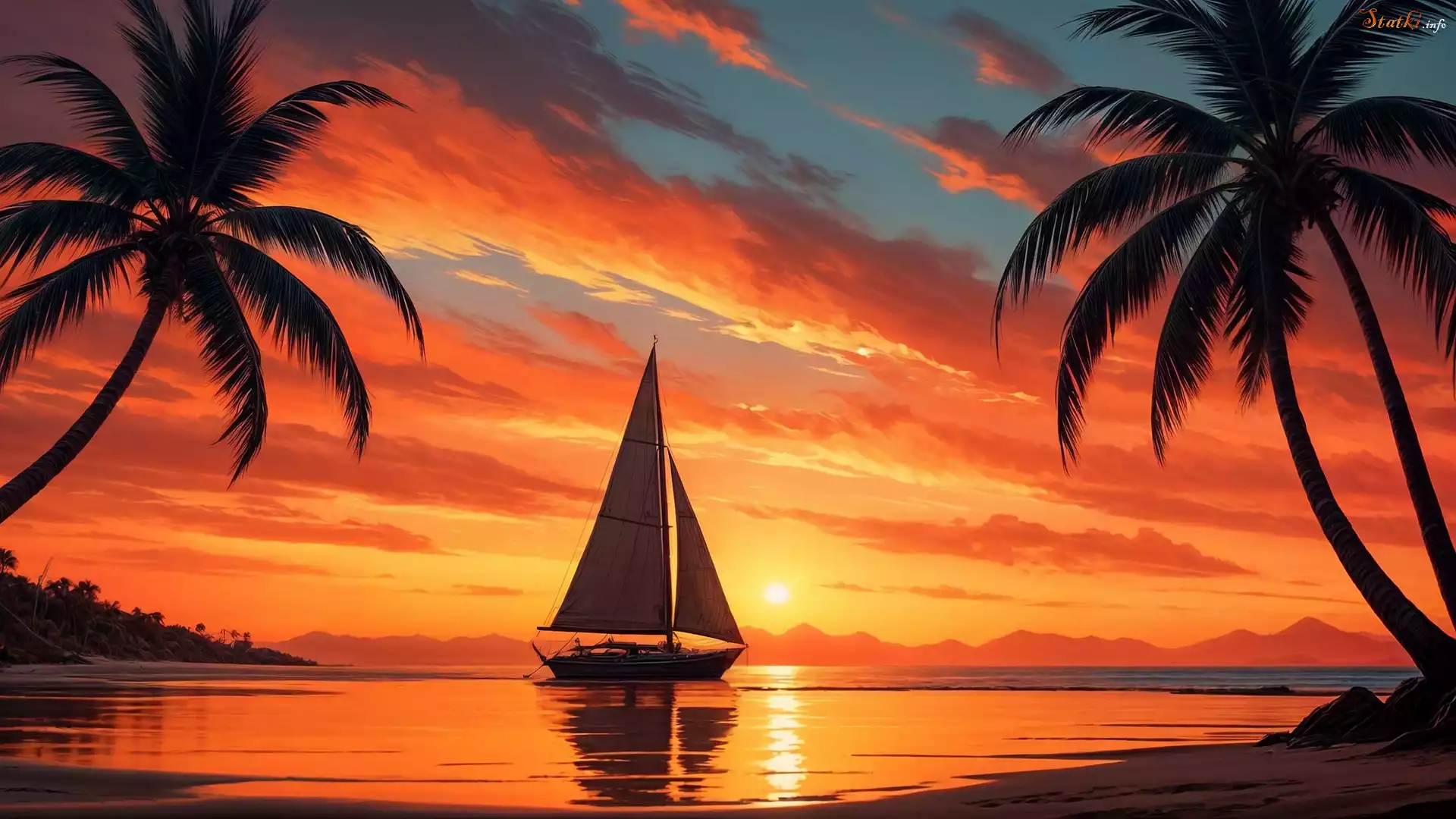 Statek Morze, Zachód słońca, Żaglówka, Palmy, Plaża, Grafika