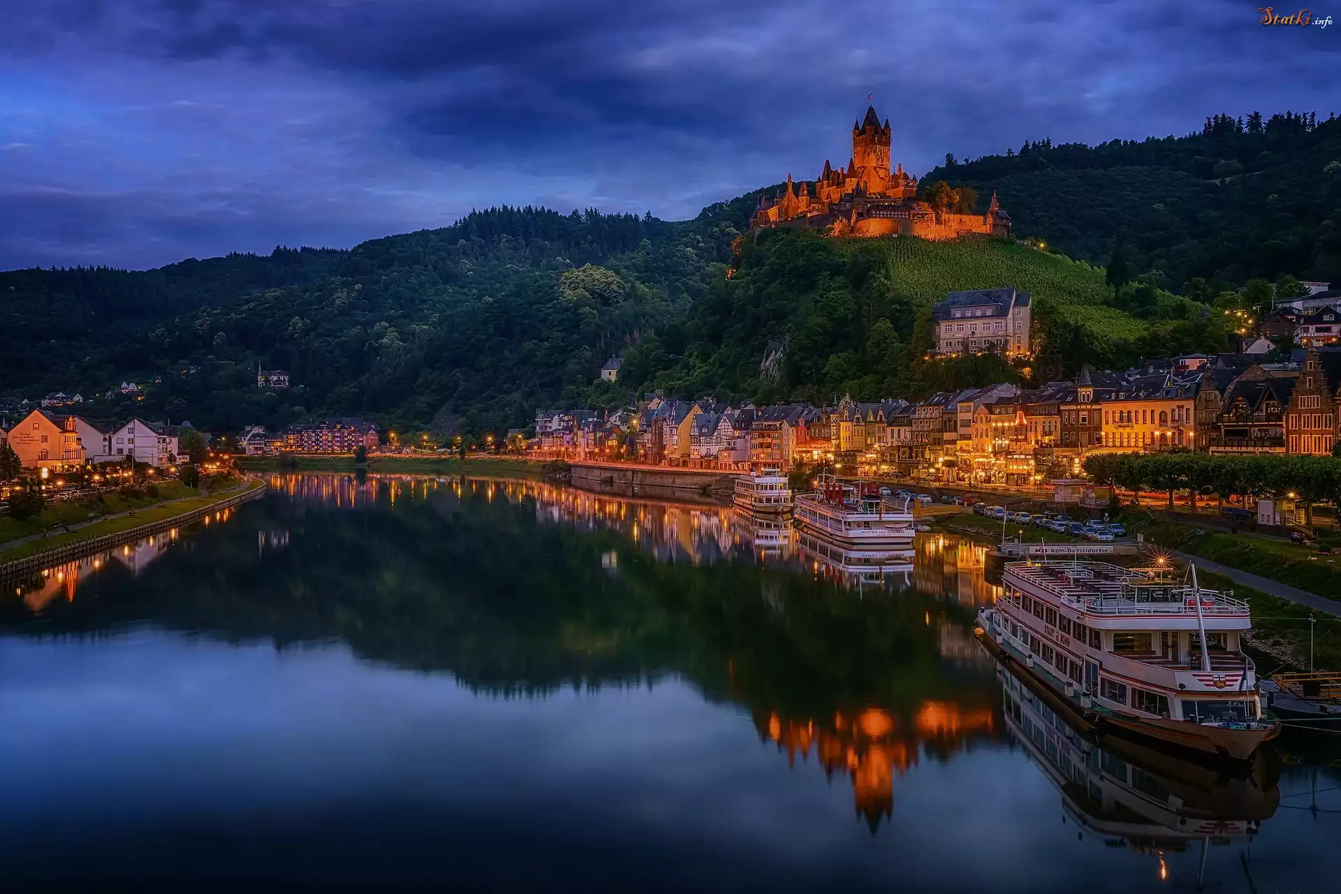 Zamek Reichsburg, Miasto Cochem, Niemcy, Rzeka Mozela, Statki, Światła, Zmrok