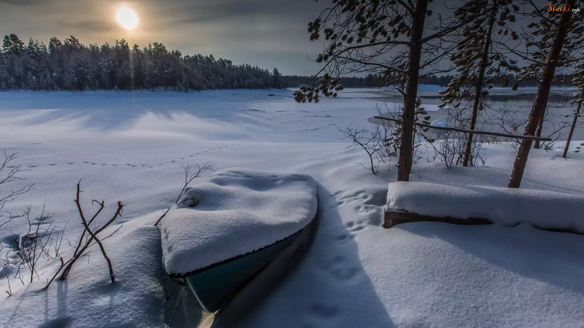 Zima, Zaśnieżone, Jezioro, Łódka, Śnieg, Drzewa, Słońce, Ślady