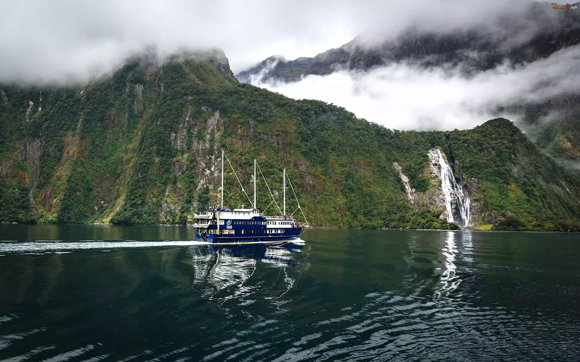 Góry, Wodospad Bowen Falls, Statek, Park Narodowy Fiordland, Nowa Zelandia