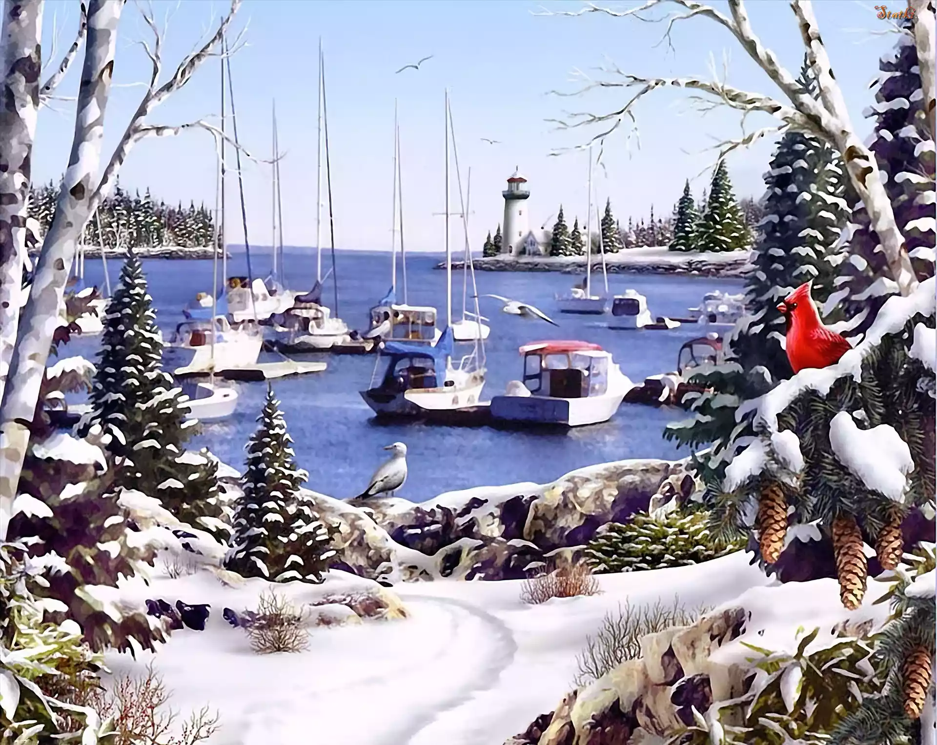 Zima, Jezioro, Żaglówki, Ptak, Kardynał